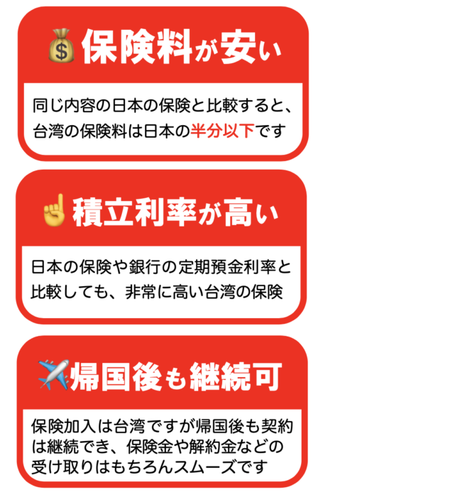上記は概要です。ご希望に応じた設計と計画が可能ですので、詳細については確認ください。ご加入は台湾在住中の今がチャンスです。帰国が決まる前に早めのご相談をオススメいたします。