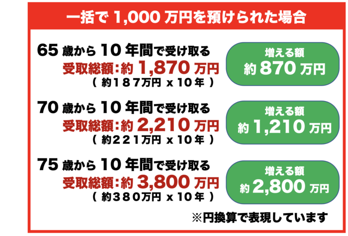 1,000万円を預けられて、65歳/70歳/75歳から10年間に分けて受け取られた場合、以下の様な今の日本では考えられない金額を受け取れることが出来ます。