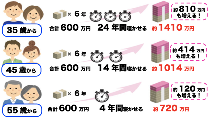 35歳・45歳・55歳の方が毎年100万円を6年間の合計600万円を支払い、65歳まで寝かせ、一括で受け取った場合の例になります。実際に寝かせる(据え置く)期間は自由にお選び頂けます。